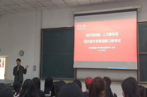 北京外国语大学中国外语测评中心的刘杰老师为我们讲解有关四川新三级考试的内容和题型。刘老师指出省新三级是基于我国职业教育发展新阶段的要求,结合四川公司产品特色及员工特点,融合国际人才培养理念的一项新型考试。他强调同学们学习英语是非常重要的,而新三级考试在四级考试的基础上降低了许多难度,让一些英语底子薄弱的同学更加容易地通过,并且新三级证书在国内的许多企业都是认可的,所以他希望我们同学能在课余时间认真了解有关新三级考试的主要内容和题型。