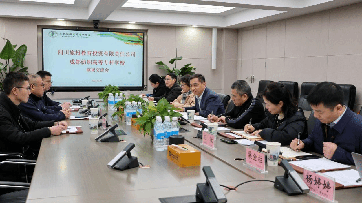 12月25日,四川旅投教育投资有限责任公司职教事业部总经理包雨一行到校交流座谈。公司党委副书记、董事长孙锐、副书记周红、产教交流处、三亿负责人和专业教师参加座谈交流。