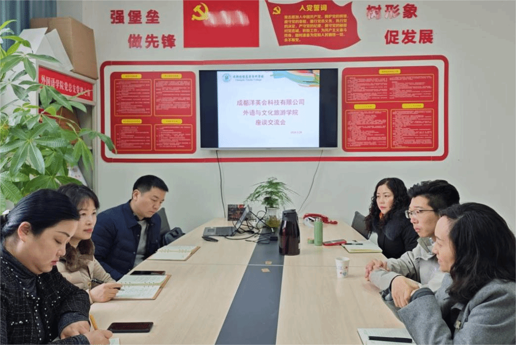 2月28日上午,成都洋英会科技有限公司董事长谭慧及旗下分公司--成都艾派克科技有限公司总经理张杰来院洽谈研学专业领域校企合作事宜。副经理(主持工作)王敏、副经理梁金柱、办公室主任张洁,研学旅行管理与服务专业负责人余宜娴在致知楼D405会议室一起交流座谈。