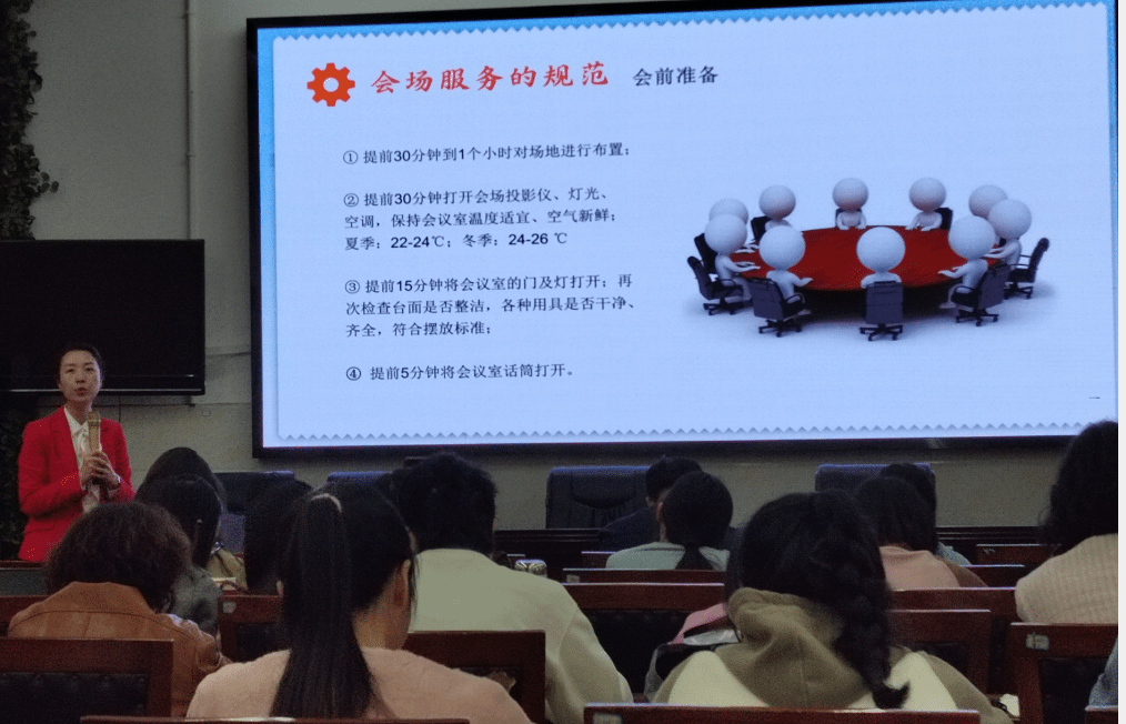 3月29日,三亿教师吕晞梅受邀为四川省档案公司进行《会议组织服务技巧》专题培训。本次培训在四川省档案公司阶梯教室进行,培训对象为该校行政各科室科长、工作人员以及酒店专业、文秘专业相关教师50余人,该校副董事长童以鸿、党委副书记李富民也出席了此次培训会。