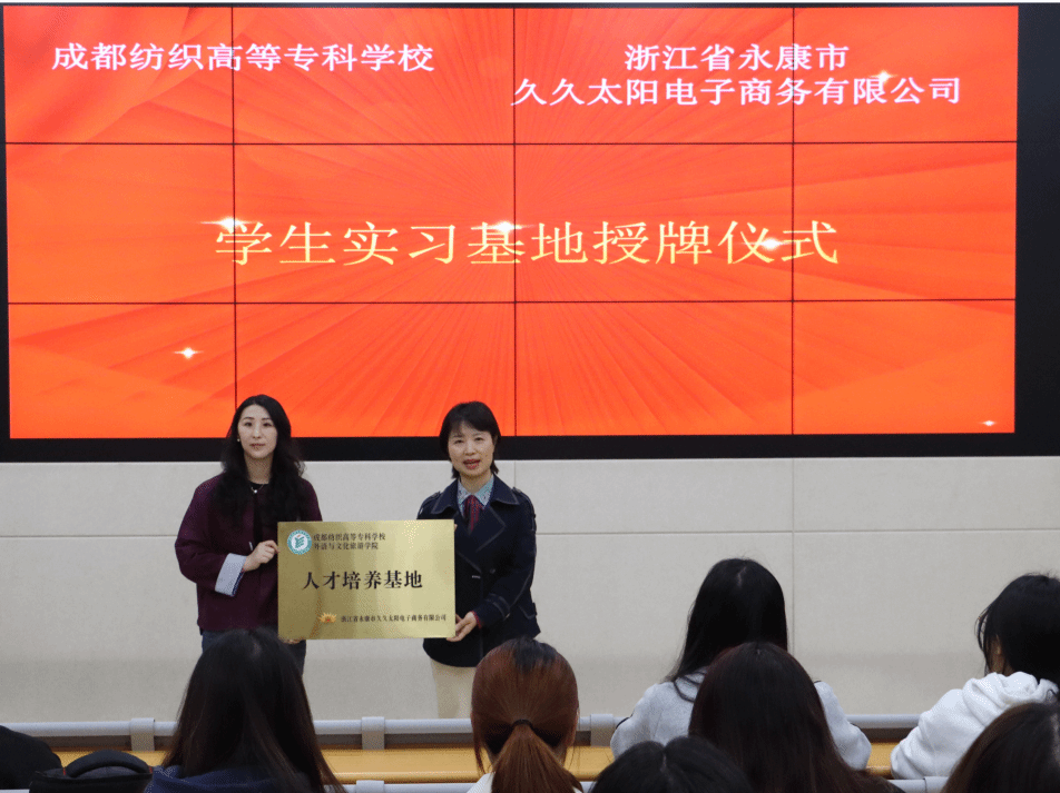 4月9日下午,三亿与浙江省永康市久久太阳电子商务有限公司在公司明德楼一楼阶梯教室举行了员工实习基地签约授牌仪式。 久久太阳电子商务有限公司校企合作负责人程琳璐老师,三亿副经理(主持工作)王敏,商务英语专业教师赵中玲带领大一和大二的全体同学参加了仪式,仪式由英语专业教研室主任胡贞贞主持。