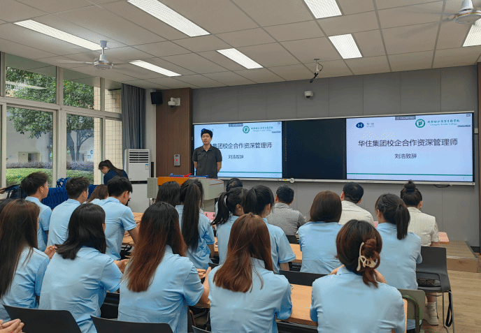 华住集团校企合作资深管理师刘浩先生对华住集团旗下的酒店品牌进行了详细地介绍,让在场的员工们对华住的多元化酒店品牌有了更深入的了解。接着,他深入浅出地解读了华住的企业文化,强调了华住集团对于服务质量和客户体验的高度重视。在谈到酒店专业员工就业前景时,刘浩先生表示,随着旅游业的快速发展和人民生活水平的提高,酒店专业就业前景十分广阔。他鼓励员工们积极投身酒店行业,实现自我价值。最后,刘浩详细介绍了华住店长订单班的人才培养项目。他表示,华住集团将通过订单班项目,为员工提供实践机会,培养具有专业技能和管理能力的酒店管理人才。订单班企业班主任赵媛媛老师也详细介绍了订单班后续的课程和活动安排。