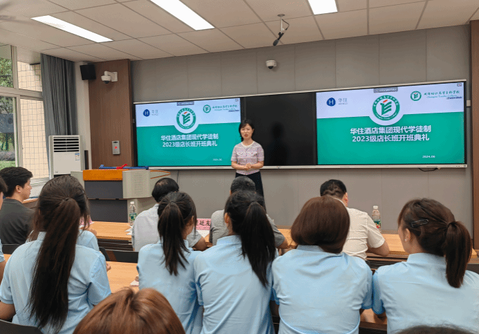 6月18日下午,酒店管理与数字化运营专业在致知楼A103举行了2023级华住店长订单班开班仪式。出席本次仪式的嘉宾有华住集团校企合作资深管理师刘浩和华住集团区域员工中心人事经理、企业班主任赵媛媛。学创处副处长刁家志、总支书记樊廷友、副经理(主持工作)王敏,副经理梁金柱、党总支副书记王珍珍、旅游教研室主任杨婷婷、酒店管理与数字化运营专业教师,以及酒店管理与数字化运营22级、23级“华住店长订单班”的全体同学参加了仪式。开班仪式由旅游教研室主任杨婷婷老师主持。