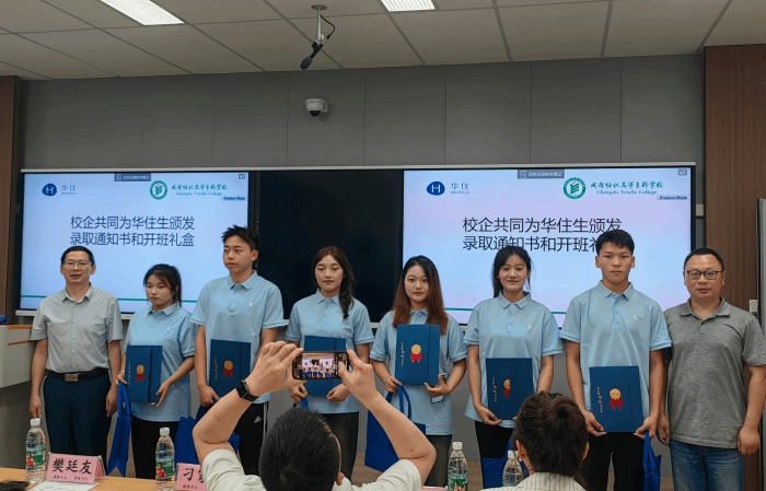 企业代表和公司领导共同为同学们发放了录取通知书。