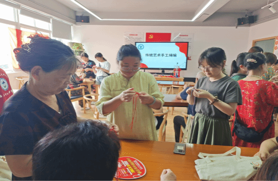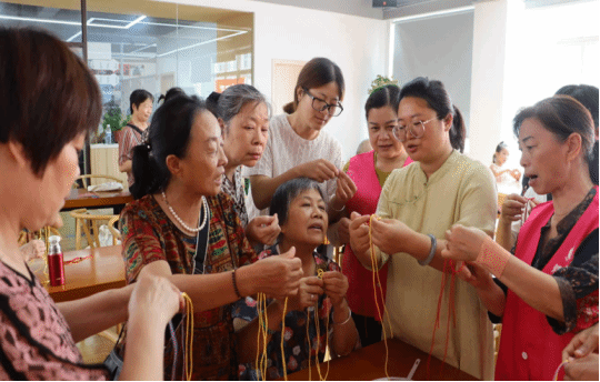 在杨老师和志愿者们的耐心指导与悉心传授下,社区居民们全神贯注地投入到学习与编织之中,手指翻飞、彩线穿梭,大家从最初的生疏到逐渐熟练,每一个人都沉浸在绳编的世界里。随着时间的推移,一根根普通的彩绳在居民们的手中逐渐幻化成精美的绳编作品。这些作品不仅展现了大家的学习成果,更传递出对传统手工艺术的热爱与敬意。