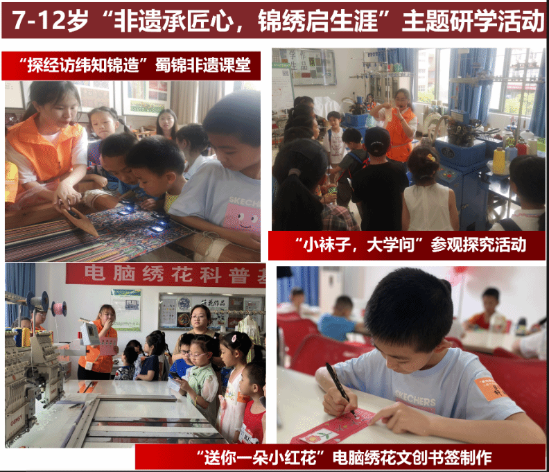 针对7-12岁“非遗承匠心,锦绣启生涯”主题,小朋友分成7-8岁和9-12岁两个小组,在纺织公司实训室分别体验了”探经访纬知锦造”蜀锦非遗课堂、“小袜子、大学问”织袜机课程与“送你一朵小红花”电脑绣花文创书签制作,通过主题研学让小朋友对非遗匠心、职业分工等有了更深的认识,负责指导服务的研学指导师通过参观探究与动手体验活动课程,进一步让小朋友认识到了非遗文化传承、劳动职业分工与读书学习的价值。