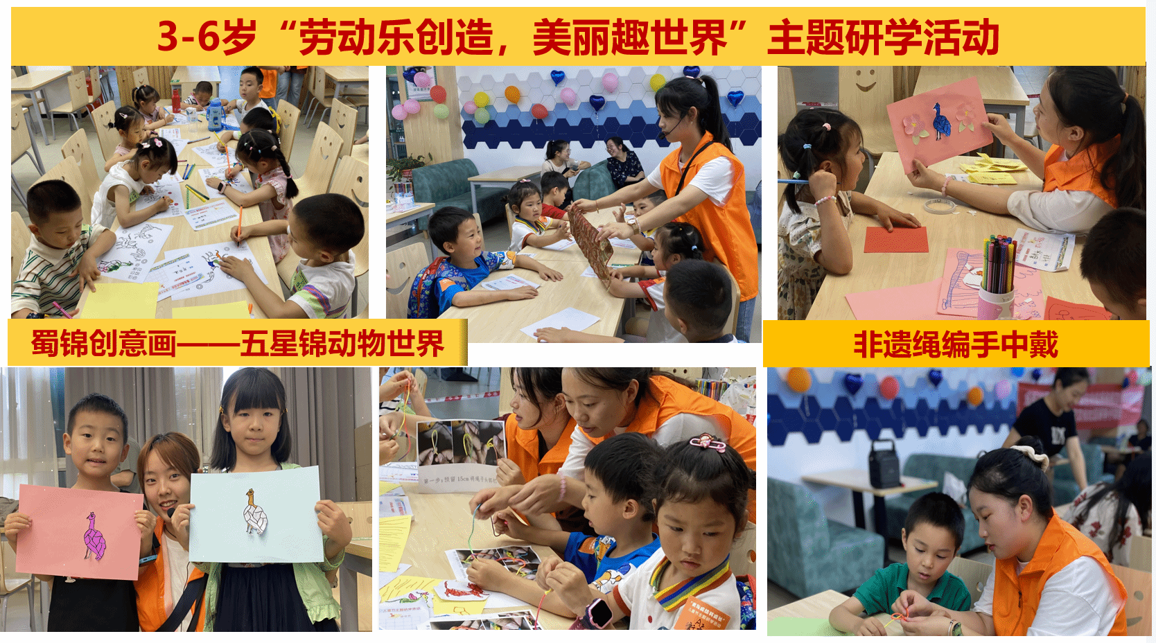 针对3-6岁小朋友“劳动乐创造,美丽趣世界”主题,小朋友分3-4岁A1组和5-6岁A2组分别完成了不同难度蜀锦典型花纹的创意画“五星锦动物园”、非遗绳编手工、“送你一朵小红花”纸艺手工,让小朋友通过自己双手快乐制作创造美丽有趣的生活饰品。