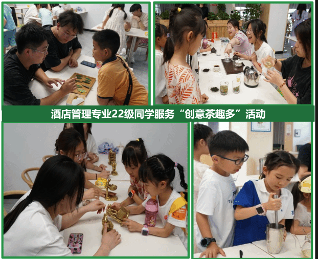 下午活动分成了两组,年龄稍大一组小朋友在杨婷婷、吕晞梅老师带领酒店管理22级志愿者同学指导下,动手体验趣味调饮茶活动,从认识茶叶、学习做茶过程、调制茶饮体验、品尝创意调配茶,一起学习领略了中国特色传统茶与新式茶调饮的魅力。