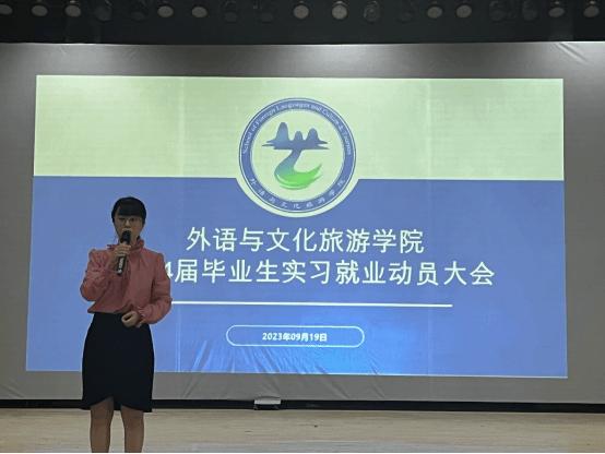 最后,商务英语教研室负责人胡贞贞老师、旅游英语教研室何洹洹老师、旅游日语教研室刘洋老师分别就顶岗实习相关文件要求、毕业设计安排等方面给毕业生们做了详细的讲解和说明,并现场解答了同学们的疑问。